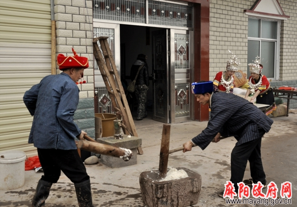 九月半 位於湘黔邊境的郭公坪鄉官硐(幹峒)村,過重陽不在九月初九,而在九月十五,俗稱“九月半”,形似其他地方過年。麻陽盛行打糍粑慶重陽,糍槽是不可缺少的工具。據傳,一年重陽,官硐的劉氏兩兄弟,都忙於過節,清貧的劉弟欲借富裕的劉兄家的糍槽打小米糍粑,結果遭到劉兄一頓羞辱,說劉弟家窮無米,竟用小米打糍粑,弄髒了糍槽。從此兄弟倆翻臉,劉弟一氣之下,將重陽節推到九月半,誓不與劉兄一起過重陽,“九月半”因此沿襲。官硐“九月半”熱鬧非凡。舉村上下,老老少少,都放下了手中的農活,高高興興地歡度重陽。天還未亮即早起殺豬;中午,遠近的親朋好友,從四麵八方陸續應邀而來;吃過晚飯,家家戶戶都關上了門,爭先恐後地來到戲台前看戲。早時娛樂多為儺戲、花燈戲、陽戲等,現在又增加了籃球賽、電影等娛樂項目。