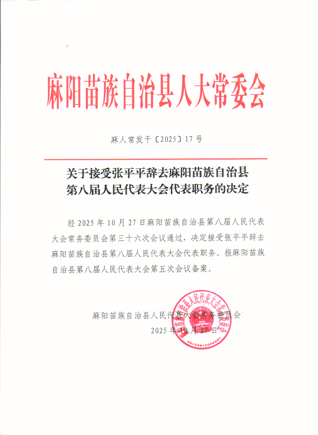 關於接受張平平辭去麻陽苗族自治縣第八屆人民代表大會代表職務的決定