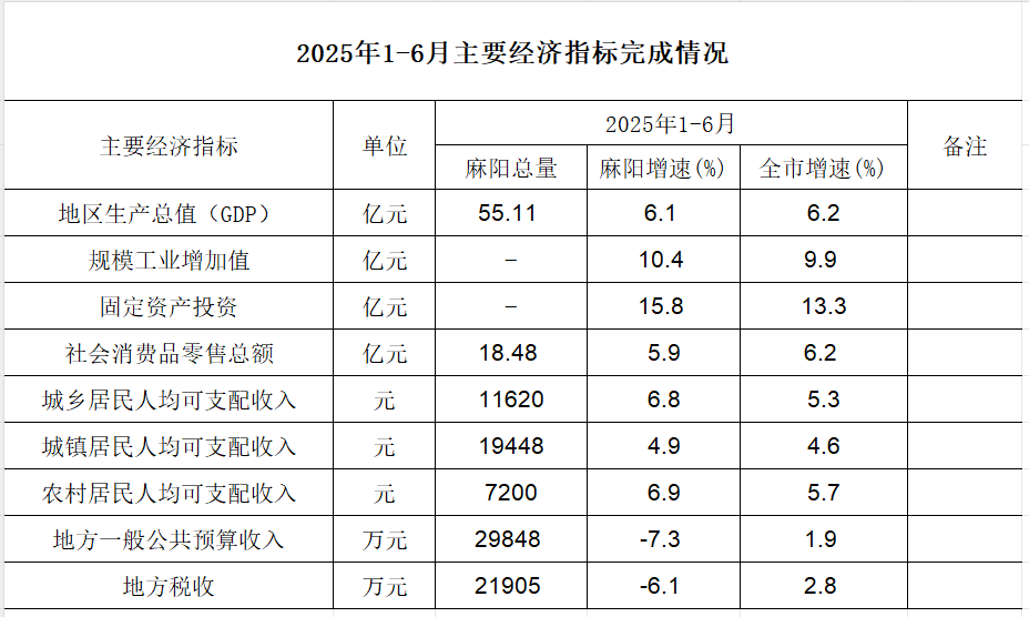麻陽苗族自治縣2025年1-6月主要經濟指標完成情況