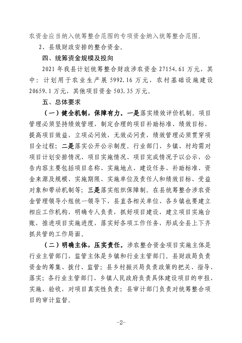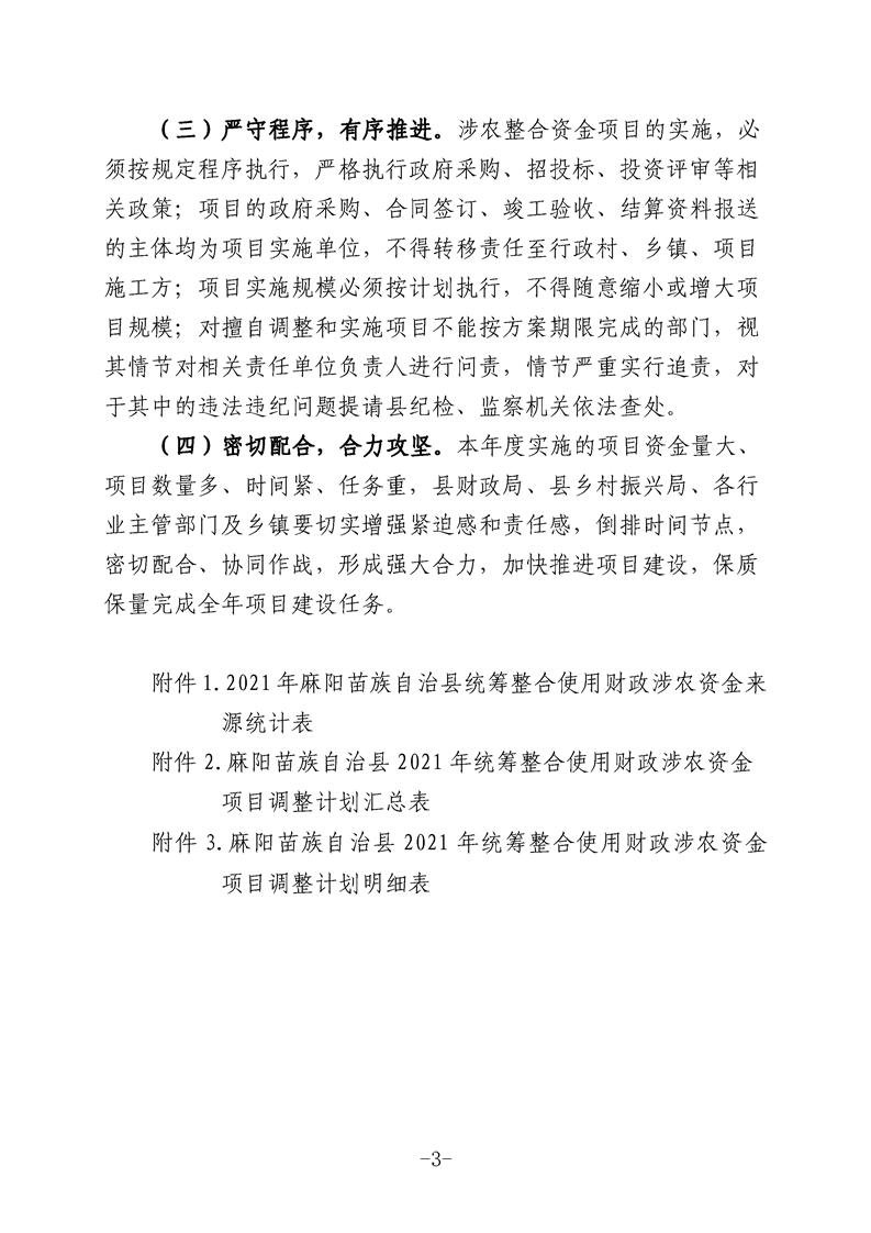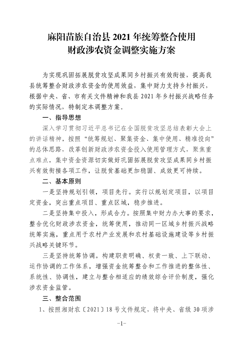 中共麻陽苗族自治縣委實施鄉村振興戰略領導小組關於印發《麻陽苗族自治縣2021年統籌整合使用財政涉農資金調整實施方案》的通知