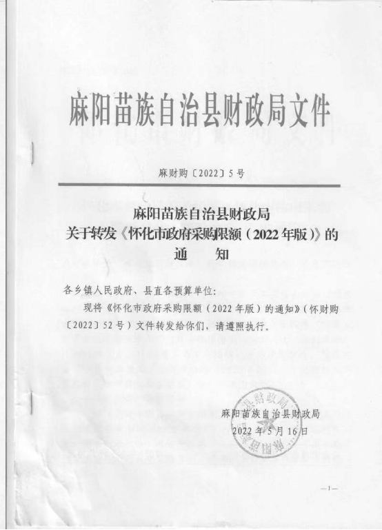 麻陽苗族自治縣財政局關於轉發《懷化市政府采購限額(2022年版)》的通知