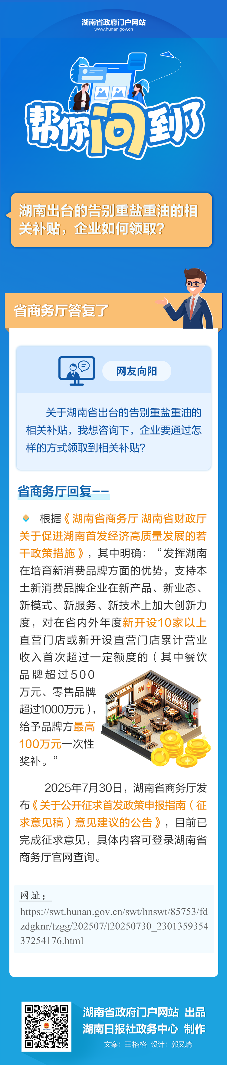 湖南出台的告別重鹽重油的相關補貼,企業如何領取?幫你問到了! 麻陽苗族自治縣人民政府 https://www.zwgsc.com 發布時間: 2025-10-21 15:47 【字體:大 小】 分享到 來源:湖南省政府門戶網站 作者: