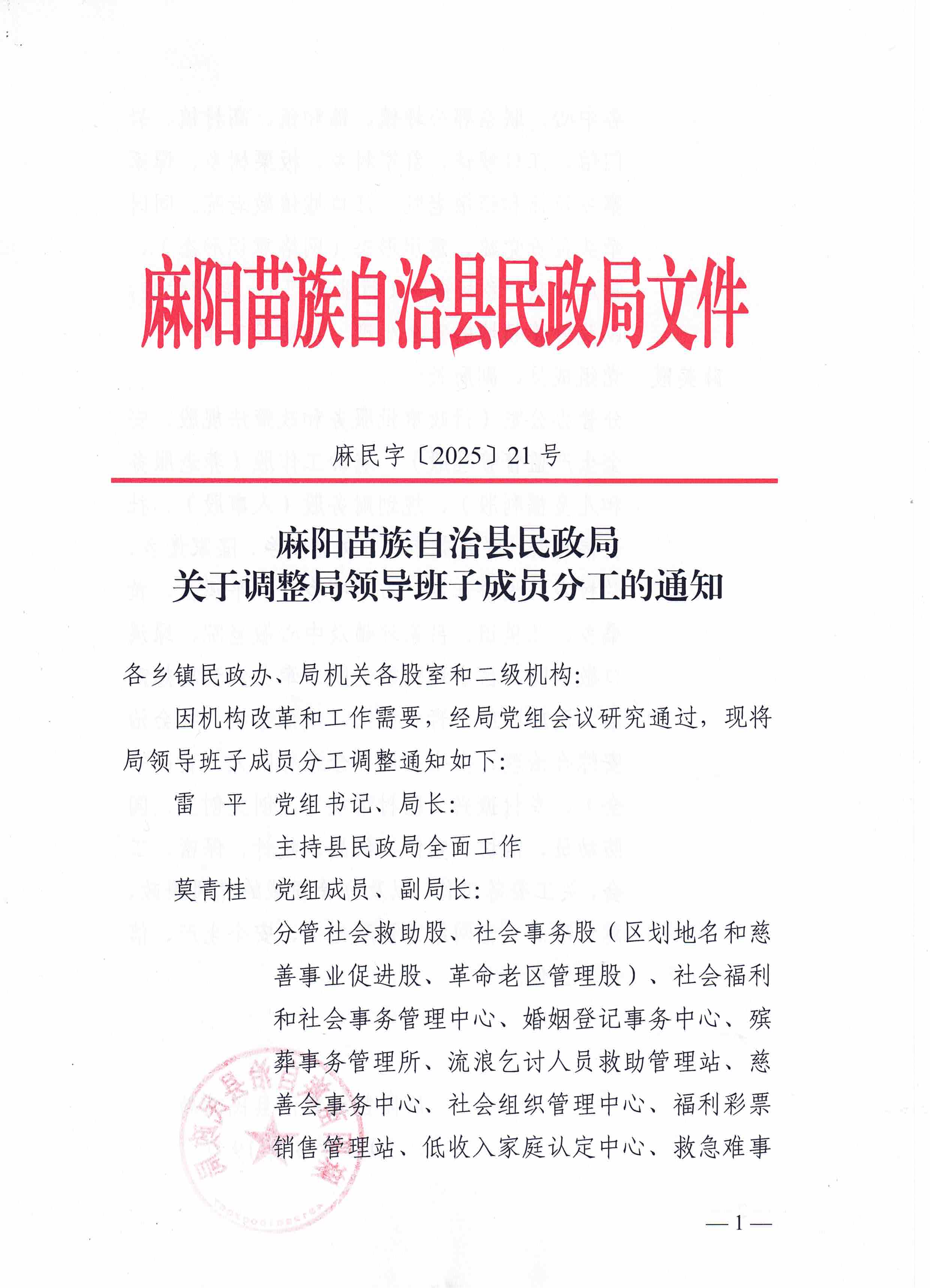 麻陽苗族自治縣民政局關於調整局領導班子成員分工的 麻陽苗族自治縣人民政府 https://www.zwgsc.com 發布時間: 2025-05-29 14:50 【字體:大 小】 分享到 來源:麻陽縣民政局 作者: