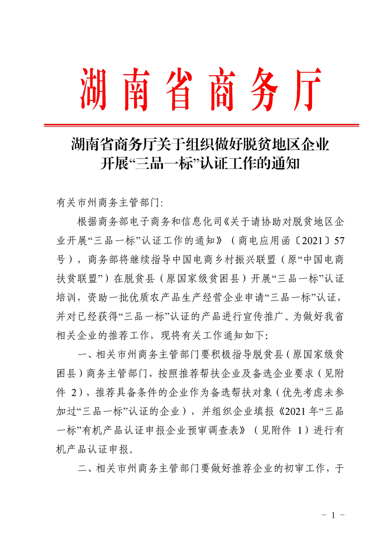 湖南省商務廳關於組織做好脫貧地區企業開展“三品一標”認證工作的通知