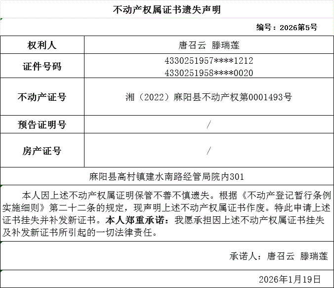 不動產權屬證書遺失聲明(唐召雲 滕瑞蓮)