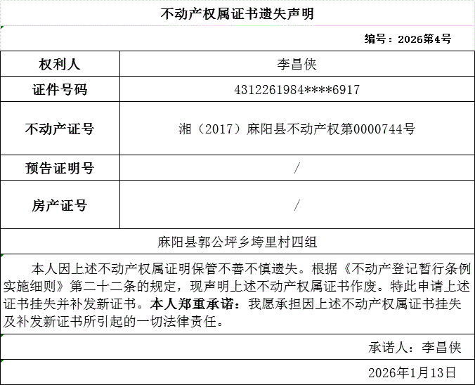 不動產權屬證書遺失聲明(李昌俠) 麻陽苗族自治縣人民政府 https://www.zwgsc.com 發布時間: 2026-01-13 15:52 【字體:大 小】 分享到 來源:麻陽縣自然資源局 作者: