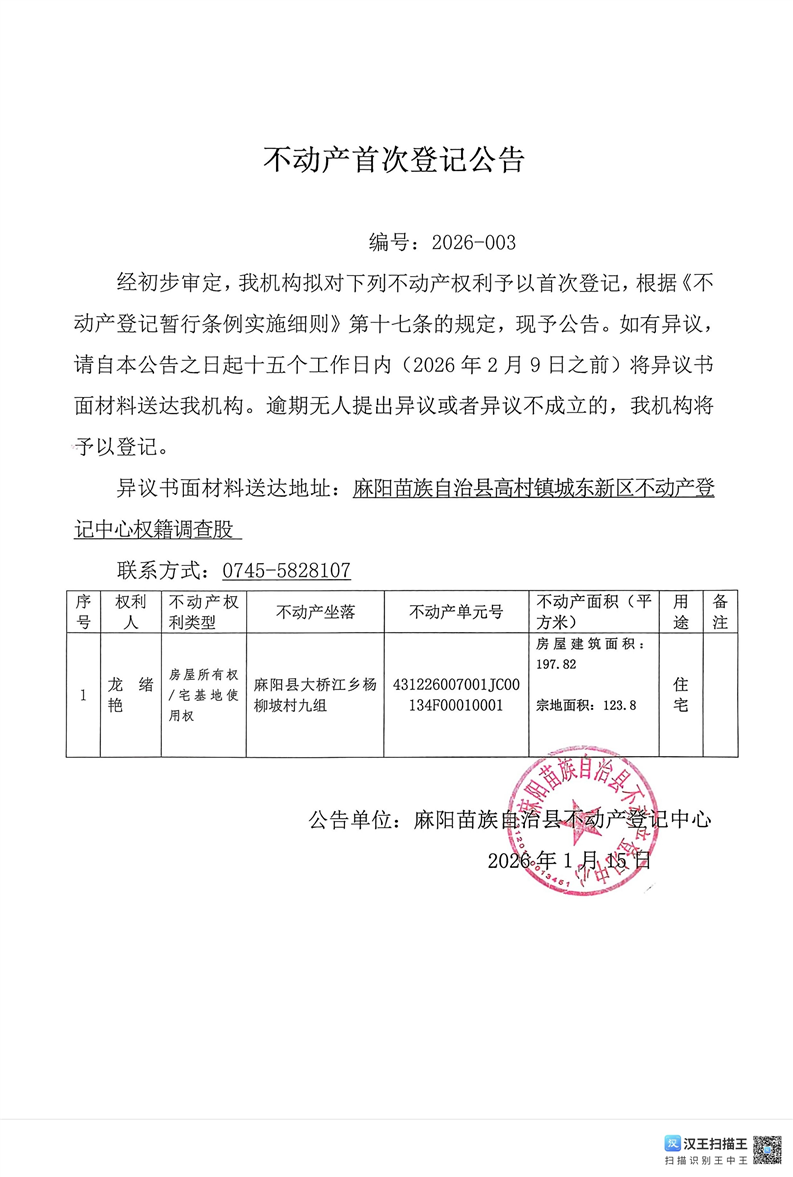 不動產首次登記公告(龍緒豔)