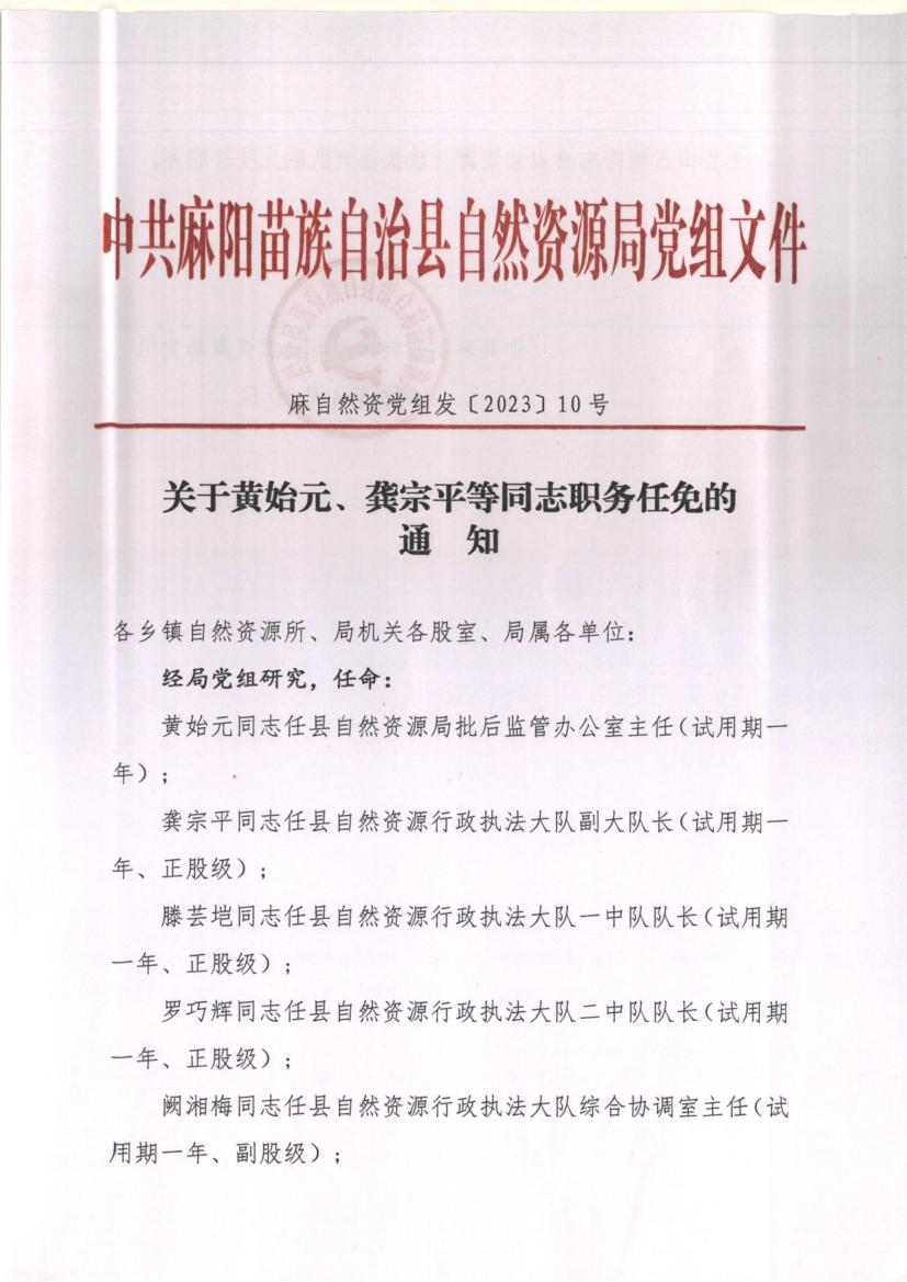關於黃始元、龔宗平等同誌職務任免的通知 麻陽苗族自治縣人民政府 https://www.zwgsc.com 發布時間: 2023-04-25 14:28 【字體:大 小】 分享到 來源:麻陽縣自然資源局 作者: