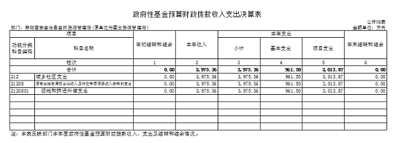 2019年度政府性基金預算財政撥款收入3975.36萬元;支出3975.36萬元,其中基本支出961.5萬元,項目支出3013.87萬元。