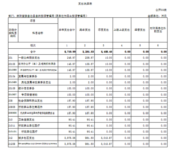 1、基本支出3261.53萬元,其中:一般公共服務支出235.57萬,占本年支出的2.7%;社會保障和就業支出157.9萬元,占本年支出的1.8%;衛生健康支出90.41萬,占本年支出的0.9%;城鄉社區支出961.5萬,占本年支出的11%;農林水支出3.23萬,占本年支出的0.03%;自然資源海洋氣象等支出1718萬元,占本年支出的20%;住房保障支出94.92萬元,占本年支出的1%。