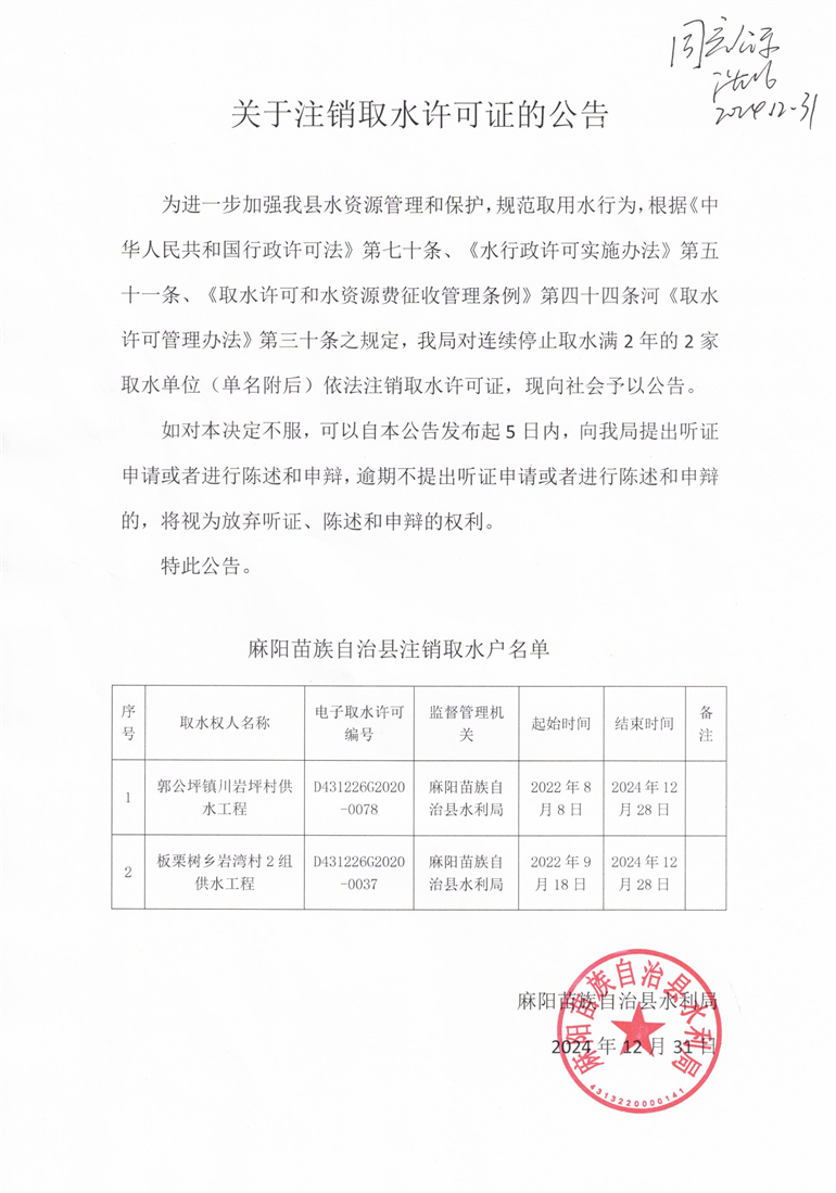 關於注銷取水許可證的公告