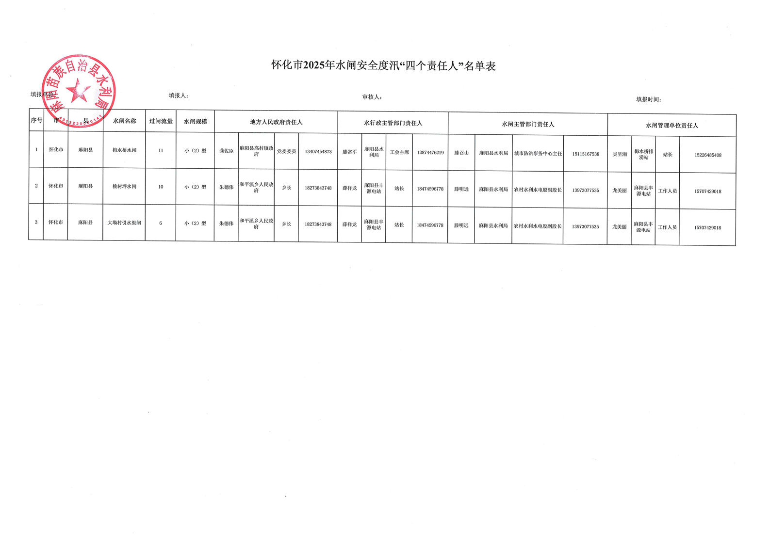 懷化市2025年水閘安全度汛“四個責任人”名單表 麻陽苗族自治縣人民政府 https://www.zwgsc.com 發布時間: 2025-04-28 09:55 【字體:大 小】 分享到 來源:麻陽縣水利局 作者: