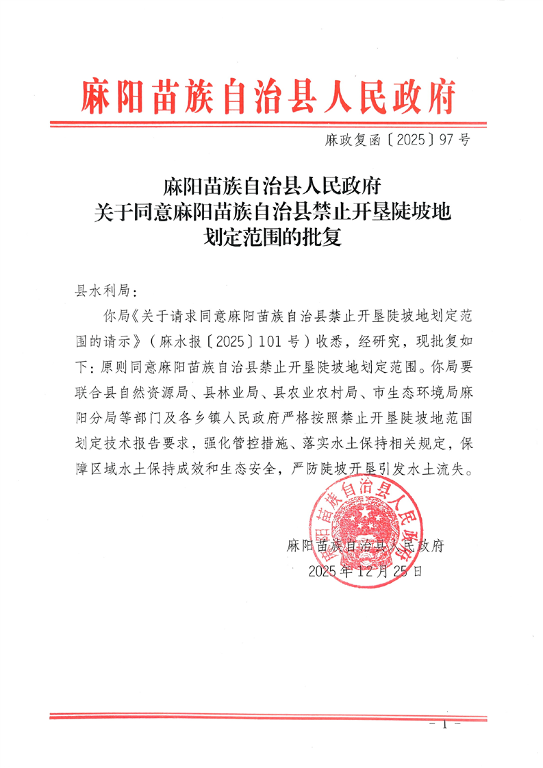 麻陽苗族自治縣人民政府關於同意麻陽苗族自治縣禁止開墾陡坡地劃定範圍的批複 麻陽苗族自治縣人民政府 https://www.zwgsc.com 發布時間: 2025-12-26 15:18 【字體:大 小】 分享到 來源:麻陽縣水利局 作者: