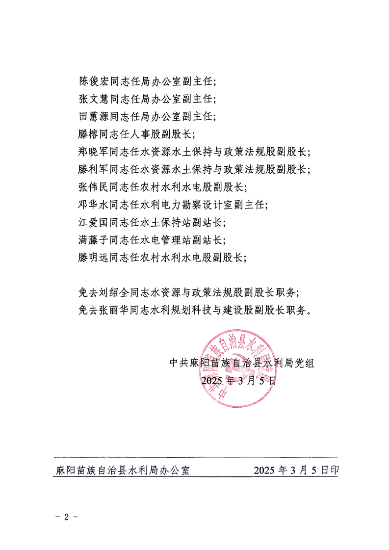 中共麻陽苗族自治縣水利局黨組關於局機關股室調整和聶廷等同誌職務任免的通知 麻陽苗族自治縣人民政府 https://www.zwgsc.com 發布時間: 2025-03-13 09:57 【字體:大 小】 分享到 來源:麻陽縣水利局 作者: