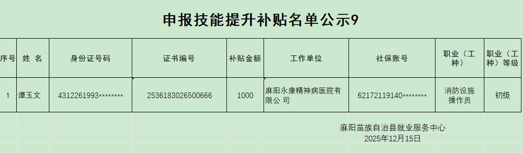 申報技能提升補貼名單公示9 麻陽苗族自治縣人民政府 https://www.zwgsc.com 發布時間: 2025-12-16 11:36 【字體:大 小】 分享到 來源:麻陽縣人力資源和社會保障局 作者: