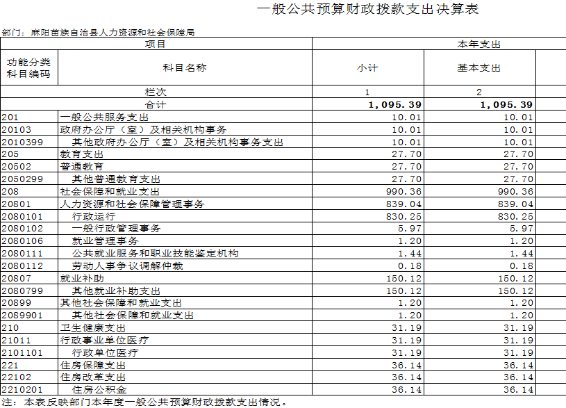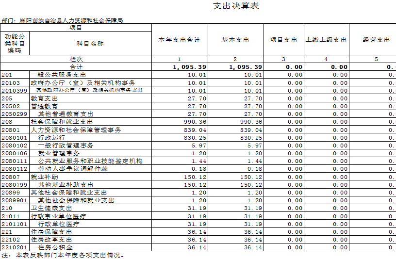 本年支出合計1095.39萬元,基本支出1095.39萬元,占比100%。其中:一般公共服務支出10.01萬元,占0.91%;教育支出27.7萬元,占2.53%;社會保障和就業支出990.36萬元,占90.41%;衛生健康支出31.19萬元,占2.85%;住房保障支出36.14萬元,占3.3%,結餘85.87萬元。