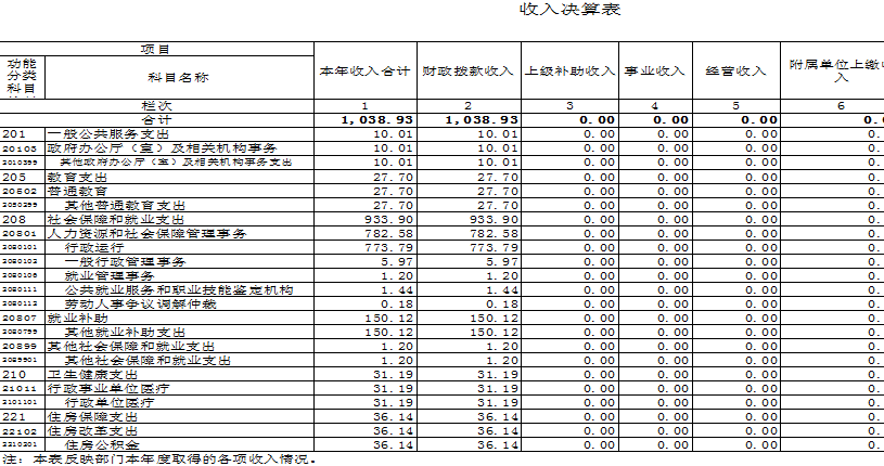 本年收入合計1038.93萬元,財政撥款收入1038.93萬元,占比100%。其中:一般公共服務支出10.01萬元,占比0.96%;教育支出27.7萬元,占比2.67%;社會保障和就業支出933.9萬元,占比89.89%;衛生健康支出31.19萬元,占比3%;住房保障支出36.14萬元,占比3.48%。