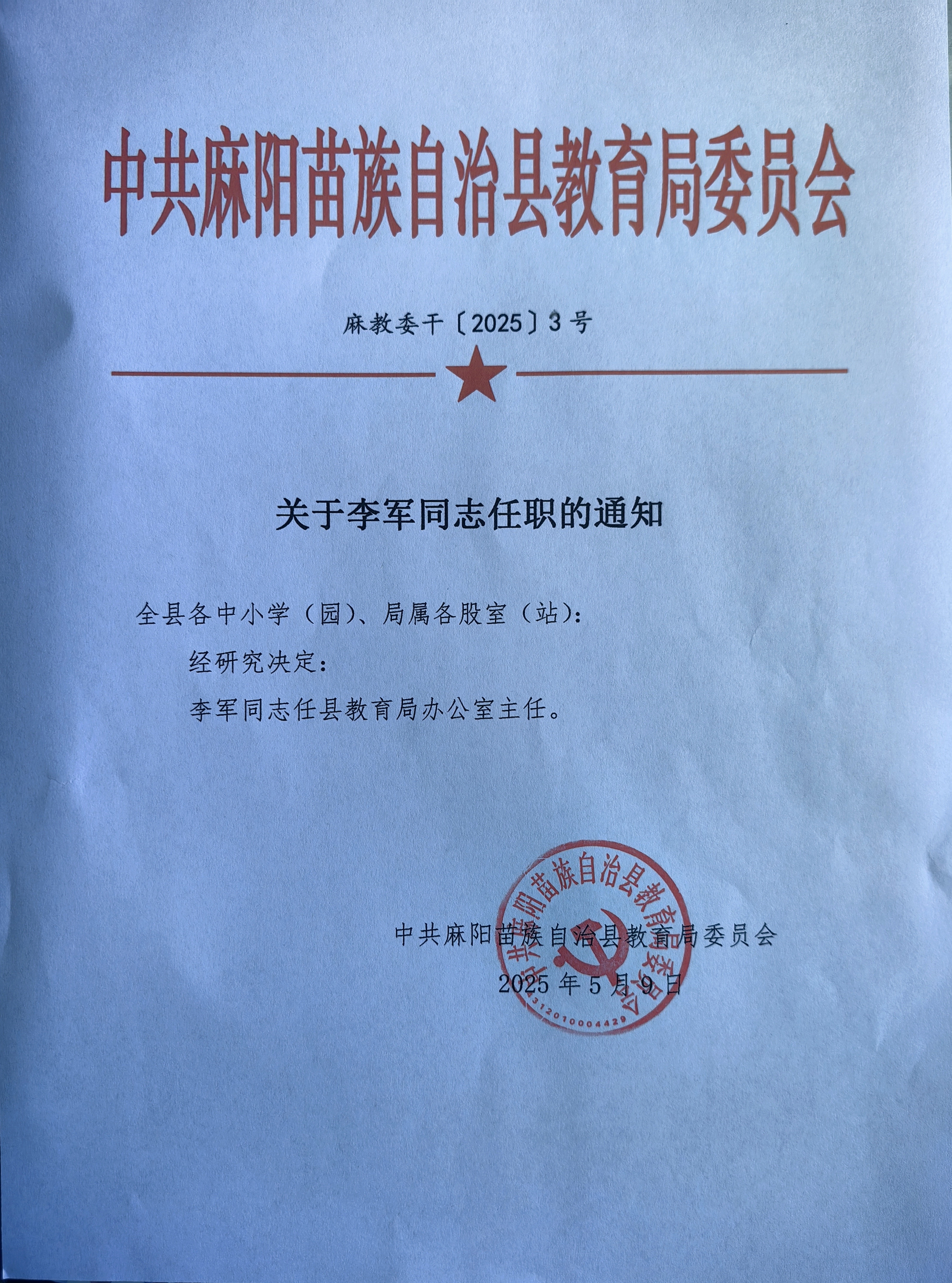 關於李軍同誌任職的通知