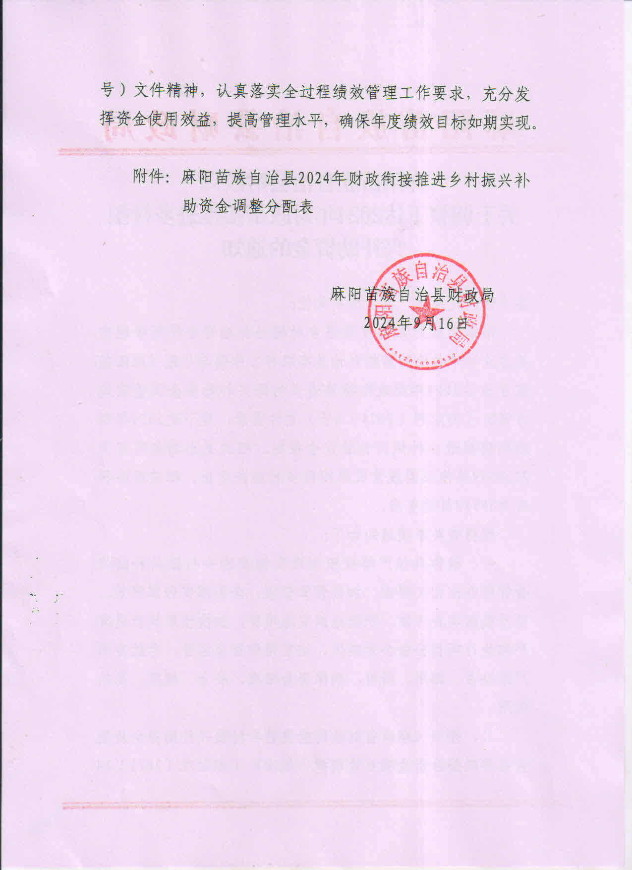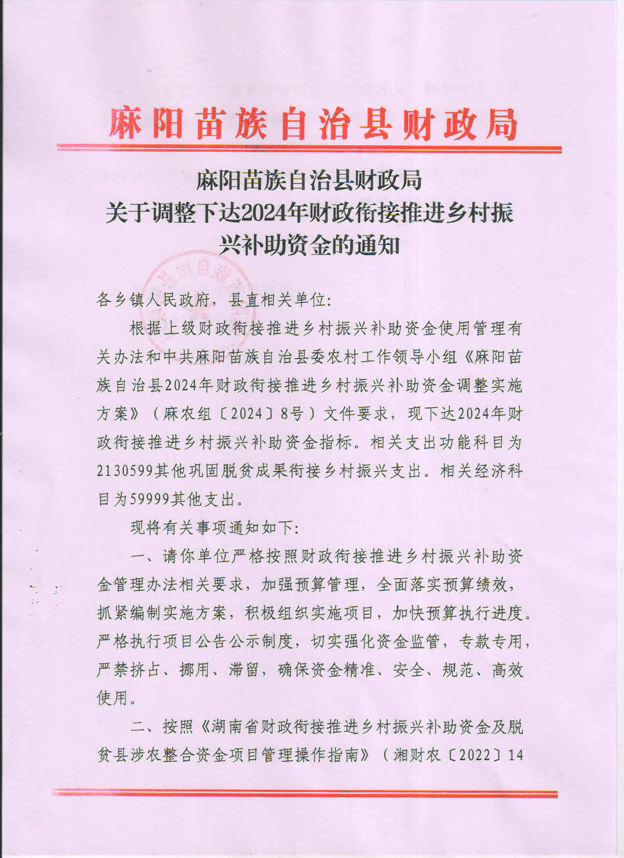 麻陽苗族自治縣財政局關於調整下達2024年財政銜接資金的通知