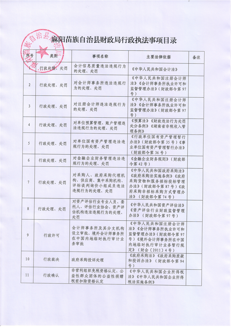 麻陽苗族自治縣財政局行政執法決定法製審核事項目錄