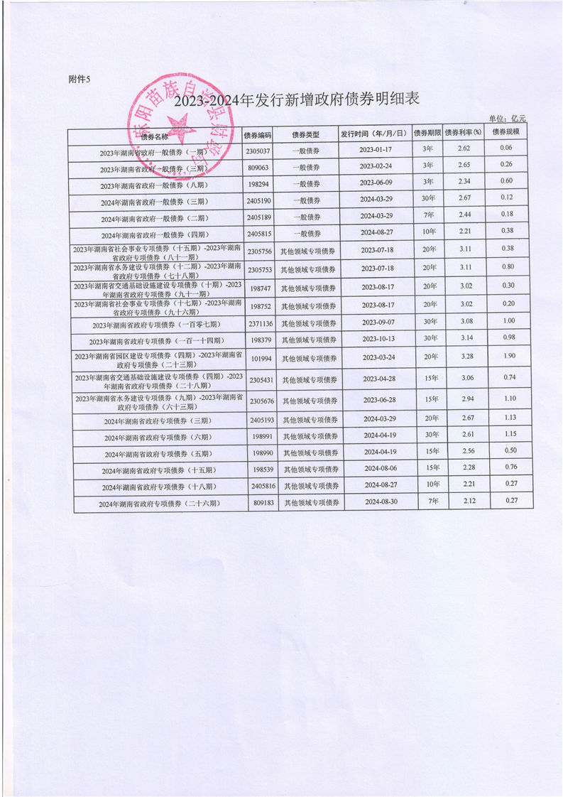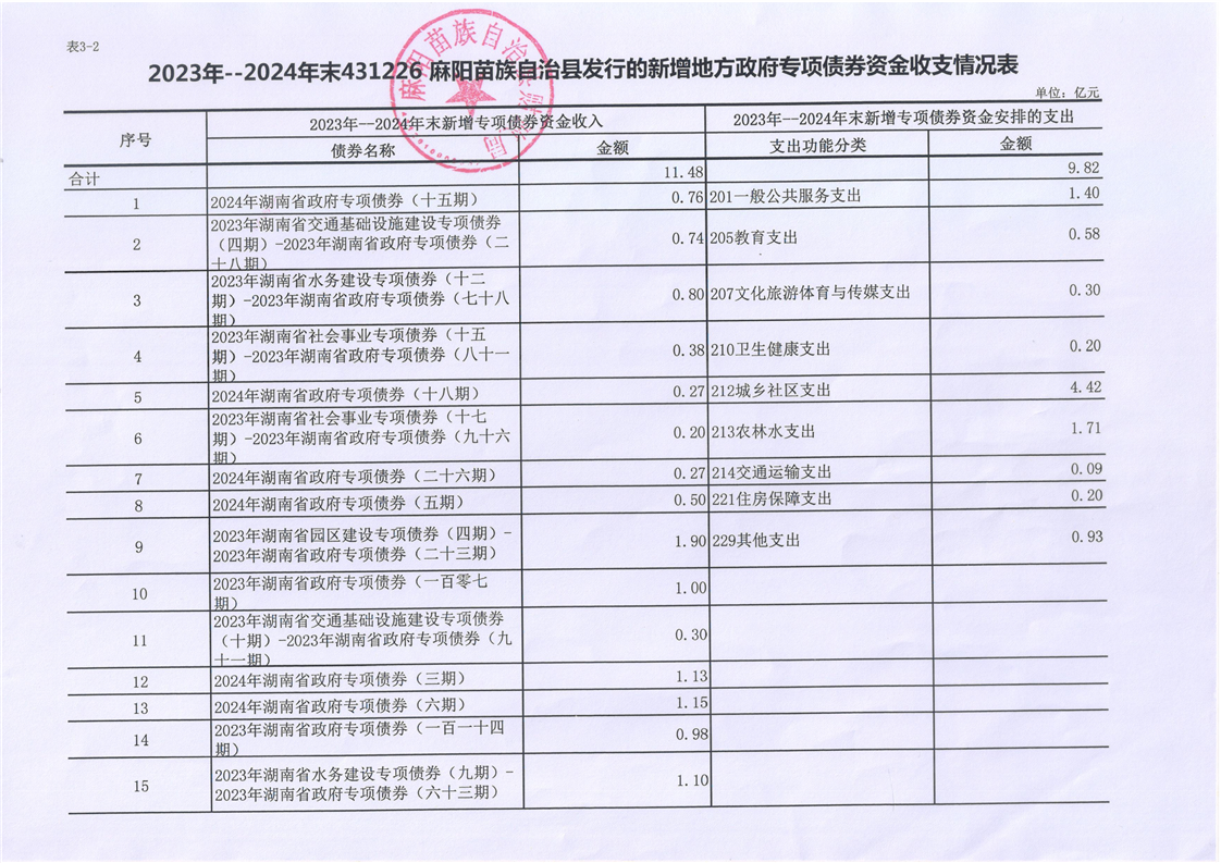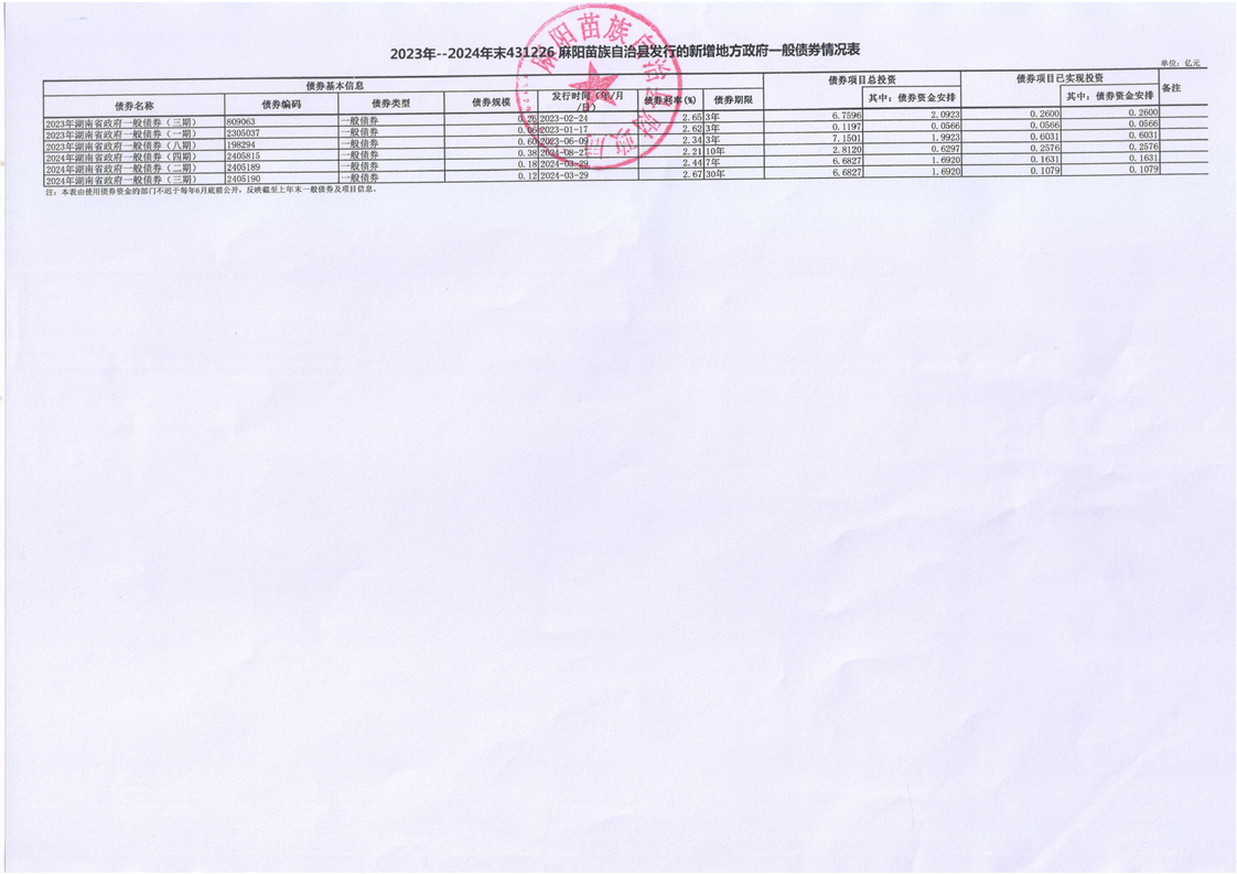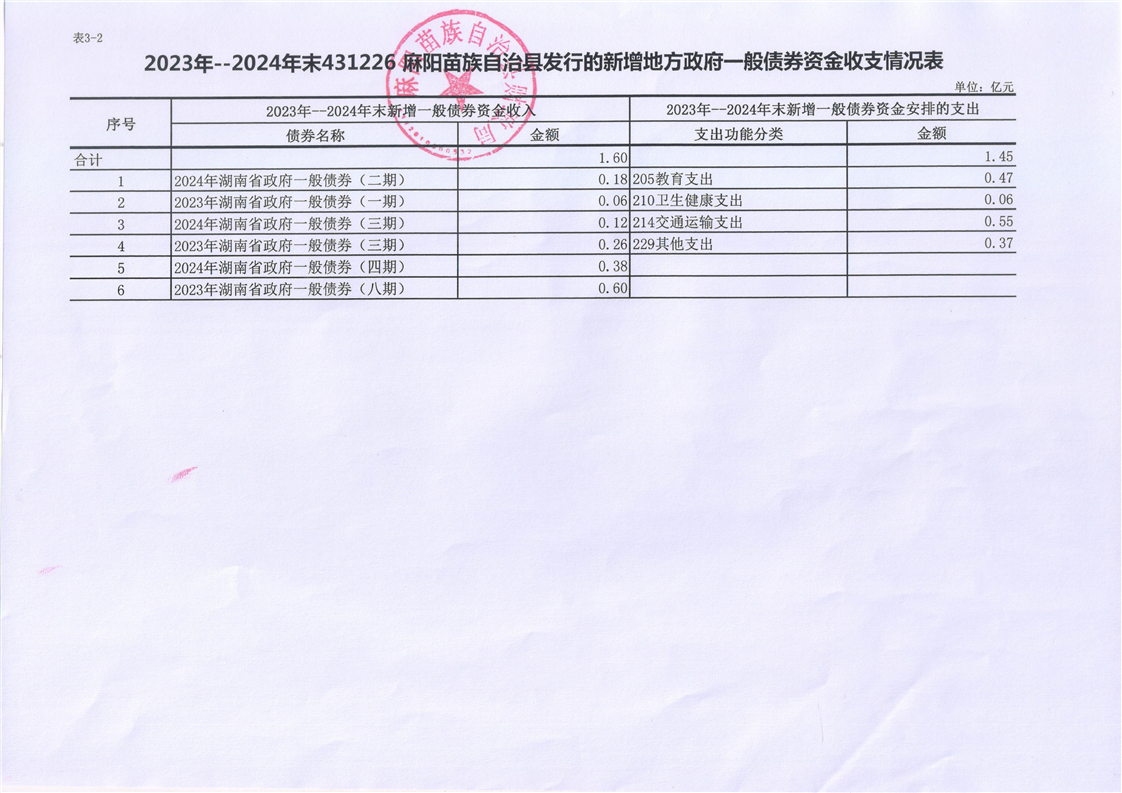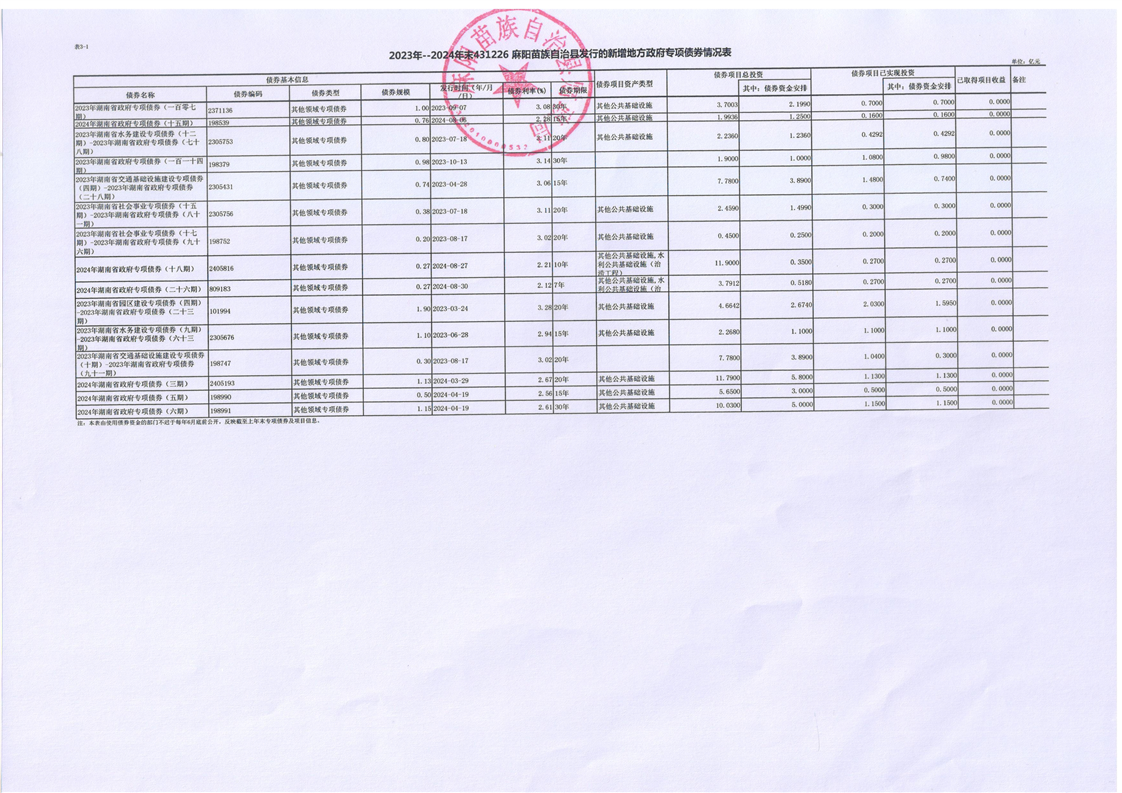 2023-2024年麻陽新增地方債券存續公開 麻陽苗族自治縣人民政府 https://www.zwgsc.com 發布時間: 2025-06-25 16:17 【字體:大 小】 分享到 來源:麻陽縣財政局 作者: