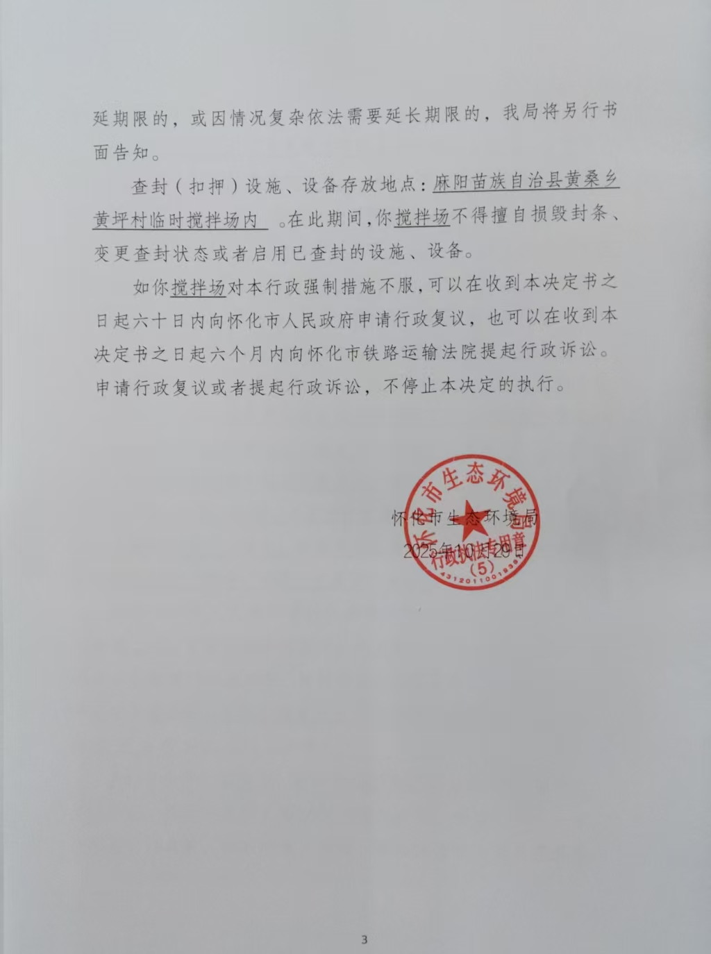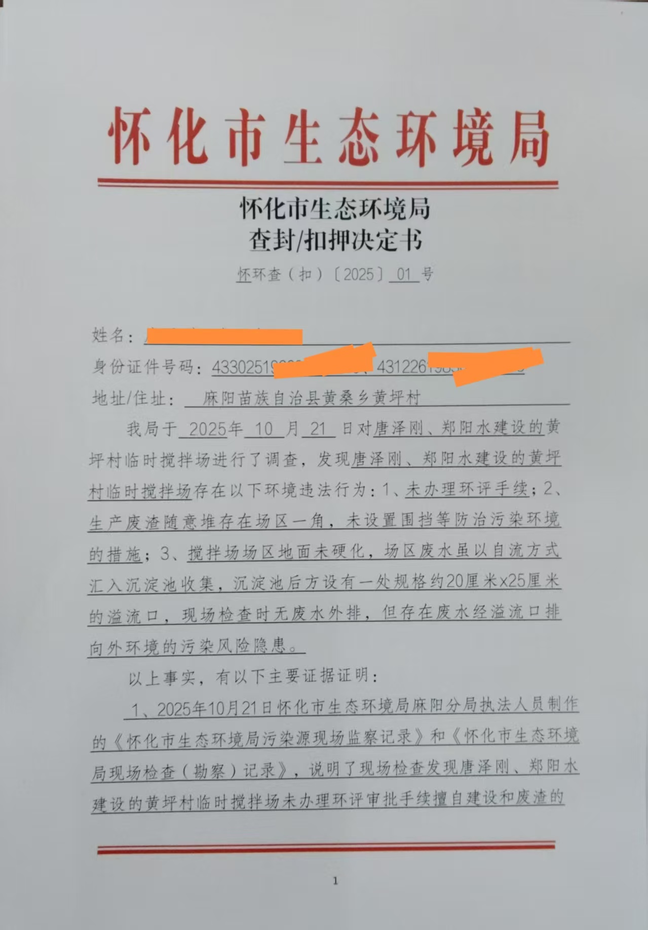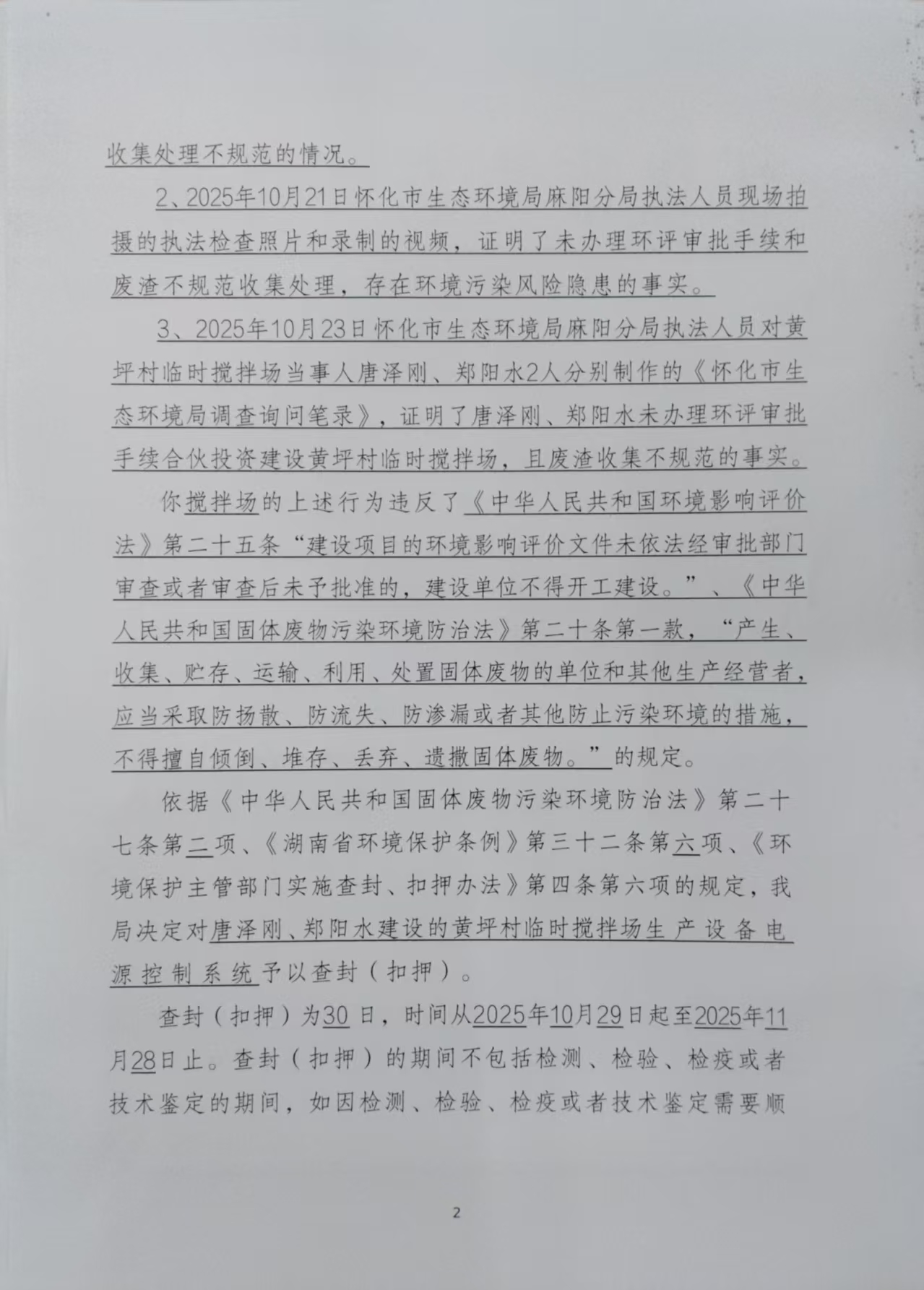 懷化市生態環境局查封、扣押決定書 懷環麻查〔2025〕01號