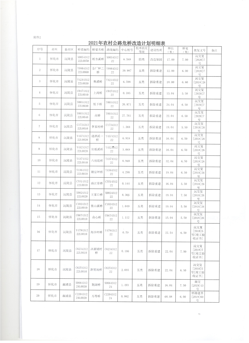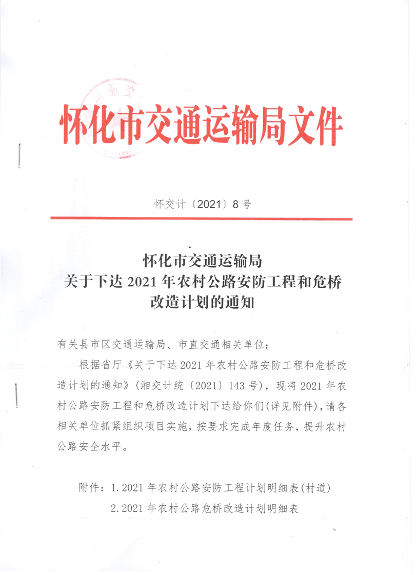 懷化市交通運輸局關於下達2021年農村公路安防工程和危橋改造計劃的通知 麻陽苗族自治縣人民政府 https://www.zwgsc.com 發布時間: 2021-11-19 14:43 【字體:大 小】 分享到 來源:懷化市交通運輸局計劃基建科 作者: