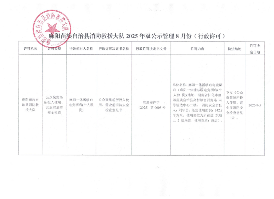 麻陽苗族自治縣消防救援大隊2025年雙公示管理8月份(行政許可) 麻陽苗族自治縣人民政府 https://www.zwgsc.com 發布時間: 2025-09-05 16:10 【字體:大 小】 分享到 來源:麻陽縣應急管理局 作者: