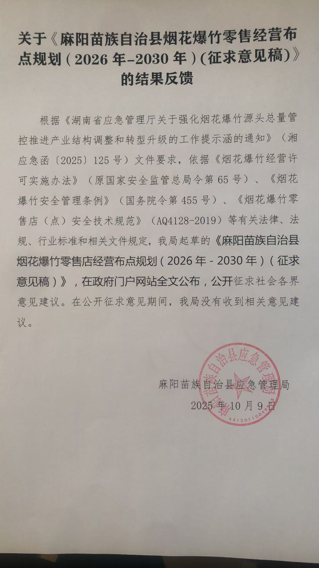 關於《麻陽苗族自治縣煙花爆竹零售經營布點規劃(2026年-2030年)(征求意見稿)》的結果反饋 麻陽苗族自治縣人民政府 https://www.zwgsc.com 發布時間: 2025-10-09 15:50 【字體:大 小】 分享到 來源:麻陽縣應急管理局 作者: