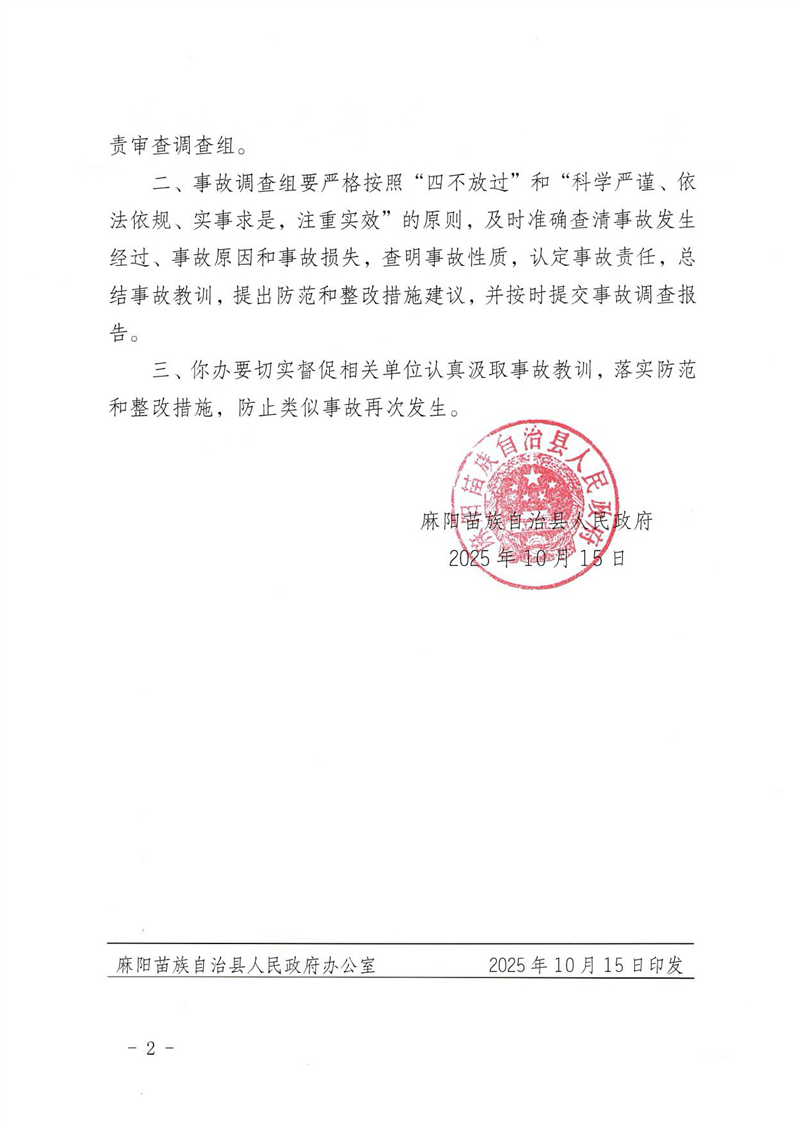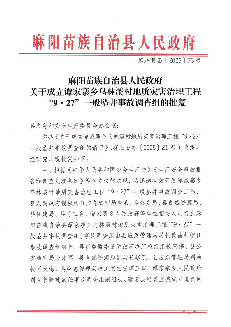 麻陽縣人民政府關於成立9.27一般事故墜井事故調查組的批複
