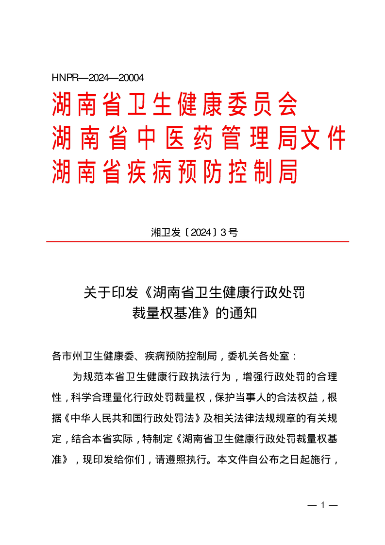 湖南省衛生健康委員會 湖南省中醫藥管理局 湖南省疾病預防控製局關於印發《湖南省衛生健康行政處罰裁量權基準》的通知 麻陽苗族自治縣人民政府 https://www.zwgsc.com 發布時間: 2024-05-17 16:06 【字體:大 小】 分享到 來源:麻陽縣衛生健康局 作者:
