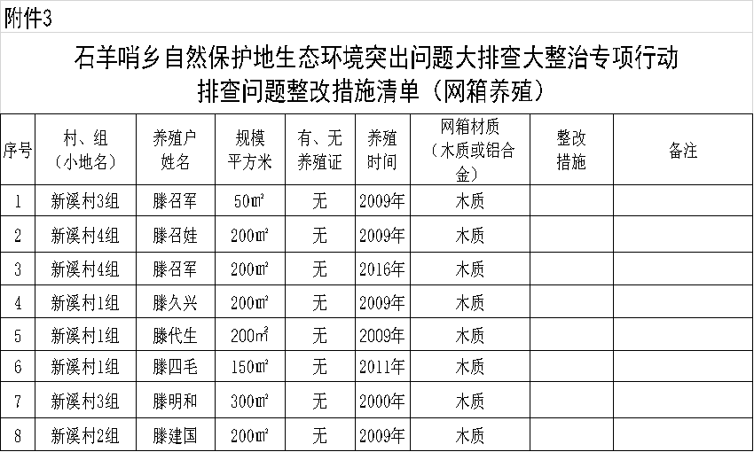 3.石羊哨鄉自然保護地生態環境突出問題大排查大整治專項行動排查問題整改措施清單(網箱養殖)