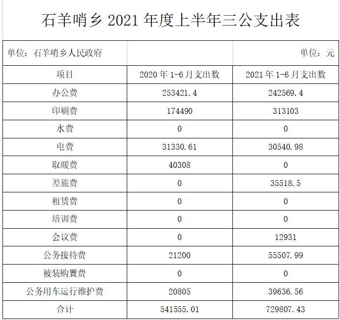 麻陽苗族自治縣石羊哨鄉2021年上半年三公支出