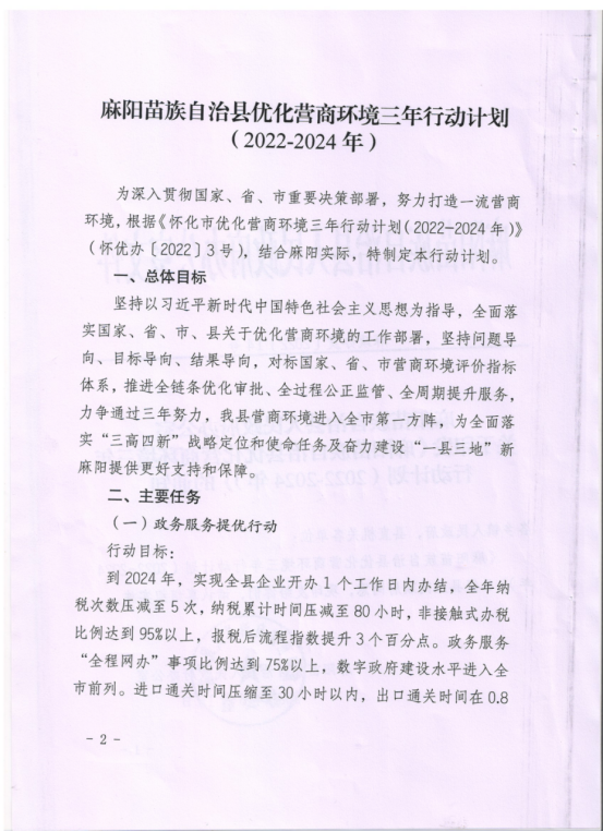 麻陽苗族自治縣人民政府辦公室關於印發《麻陽苗族自治縣優化營商環境三年行動計劃(2022-2024年)》的通知