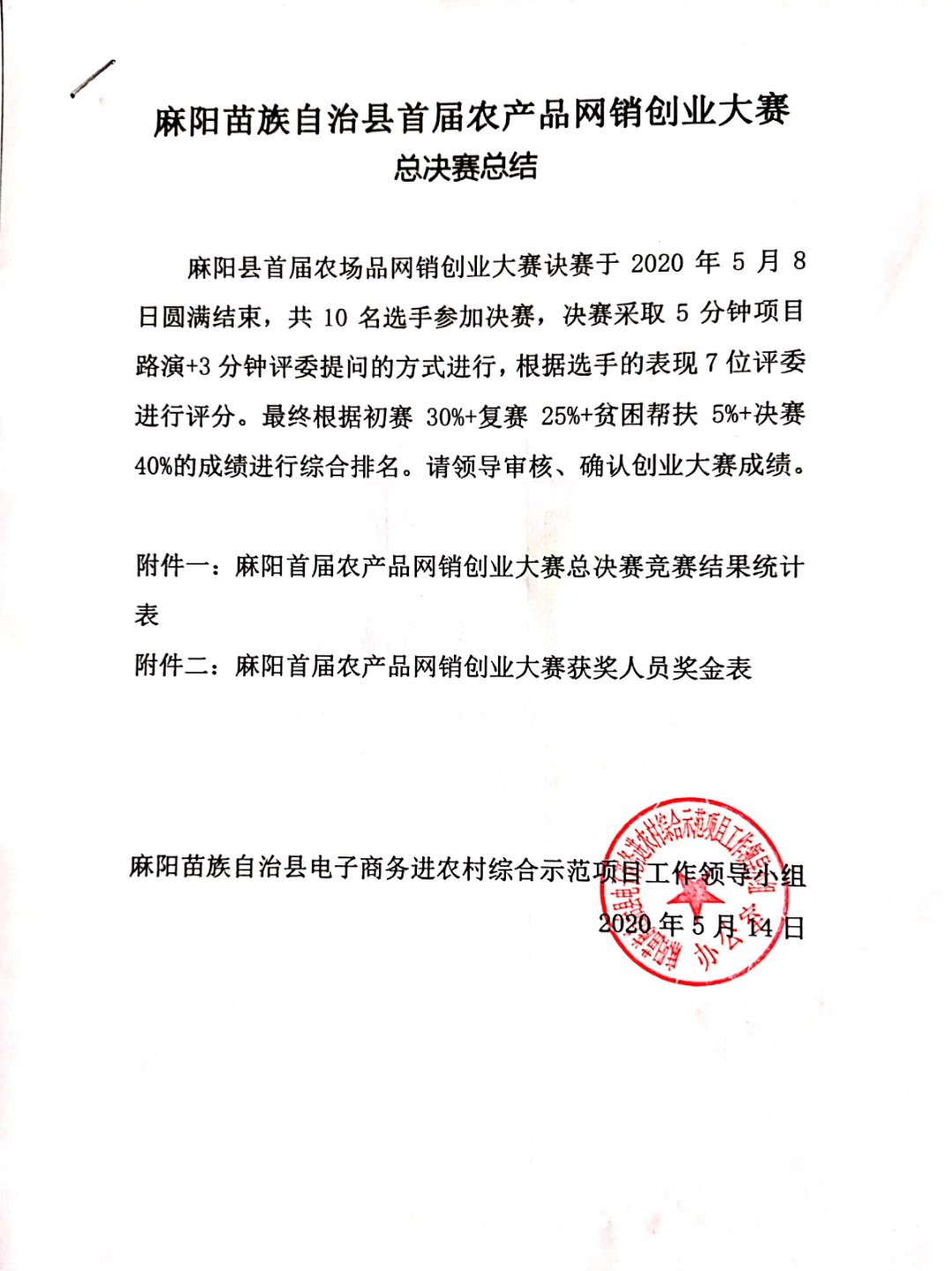 麻陽苗族自治縣首屆農產品網銷創業大賽總決賽總結 麻陽苗族自治縣人民政府 https://www.zwgsc.com 發布時間: 2020-05-14 09:50 【字體:大 小】 分享到 來源:麻陽縣商務科技和工業信息化局 作者: