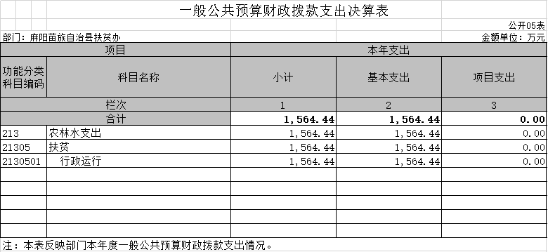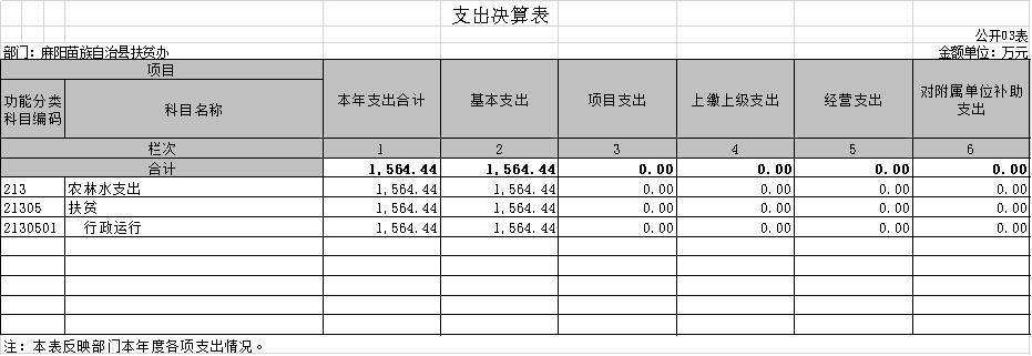 2019年財政撥款總支出1564.44萬元,與2018年相比,增加 941.21萬元,增長60.16%,主要是因為扶貧特惠保、扶貧駐村及扶貧幫扶責任人、扶貧小額信貸借款人等保險費和扶貧各項檢查所發生的其他交通費支出的增加。