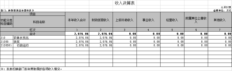 2019年度財政撥款總收入2076.06萬元,與2018年相比,增加1420.21萬元,增長68.41%,主要是因為扶貧特惠保、扶貧駐村及扶貧幫扶責任人、扶貧小額信貸借款人等保險費和其他交通費收入的增加。