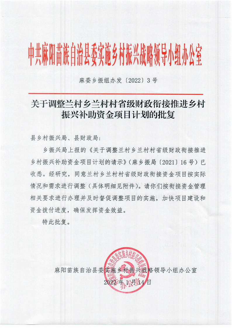 關於調整蘭村鄉蘭村村省級財政銜接推進鄉村振興補助資金項目的批複 麻陽苗族自治縣人民政府 https://www.zwgsc.com 發布時間: 2022-01-17 11:51 【字體:大 小】 分享到 來源:麻陽縣鄉村振興局 作者: