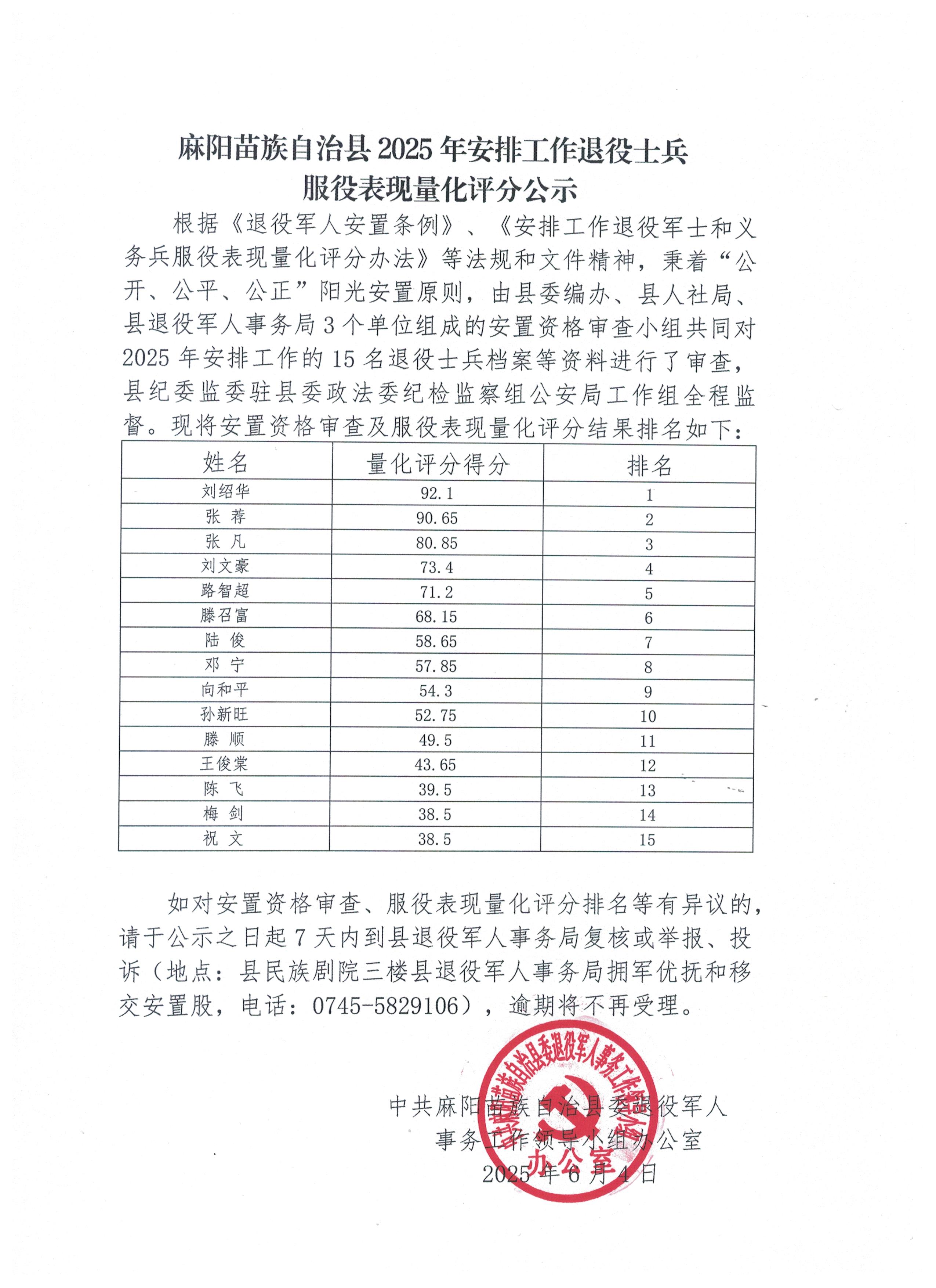 麻陽苗族自治縣2025年安排工作退役士兵服役表現量化評分公示 麻陽苗族自治縣人民政府 發布時間: 2025-06-04 11:13 【字體:大 小】 分享到 來源:中共麻陽苗族自治縣委退役軍人事務工作領導小組辦公室 作者: