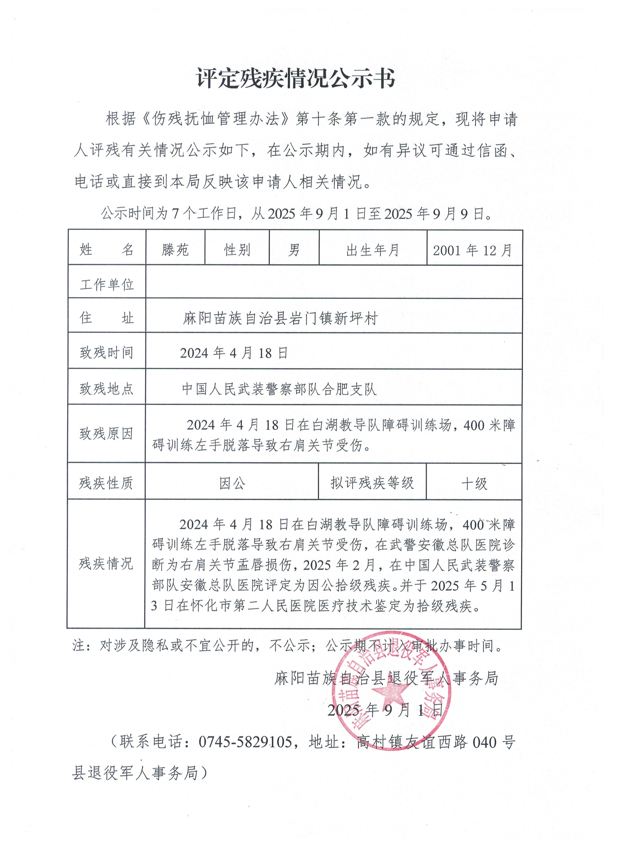 評定殘疾情況公示書(滕苑) 麻陽苗族自治縣人民政府 https://www.zwgsc.com 發布時間: 2025-09-01 09:10 【字體:大 小】 分享到 來源:麻陽縣退役軍人事務局 作者: