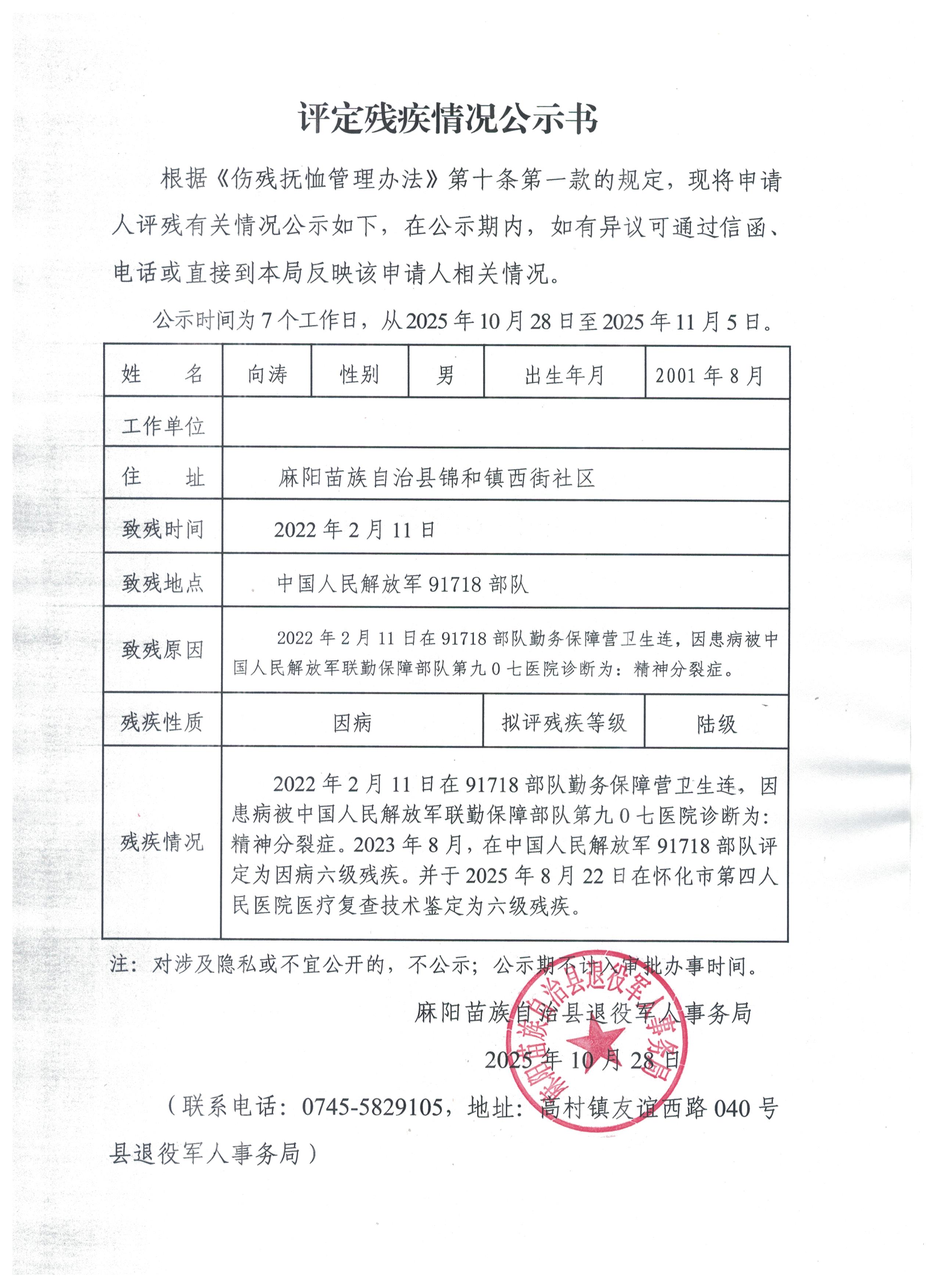 評定殘疾情況公示書(向濤) 麻陽苗族自治縣人民政府 https://www.zwgsc.com 發布時間: 2025-10-28 17:20 【字體:大 小】 分享到 來源:麻陽苗族自治縣退役軍人事務局 作者: