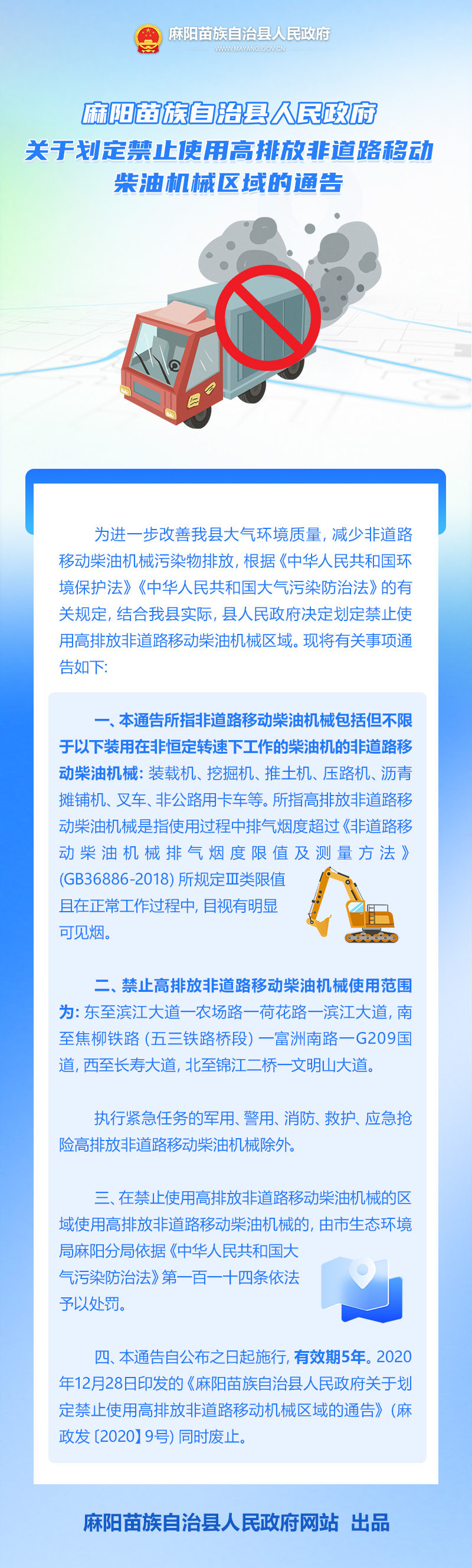 • 麻陽苗族自治縣人民政府關於劃定禁止使用高排放非道路移動柴油機械區域的通告