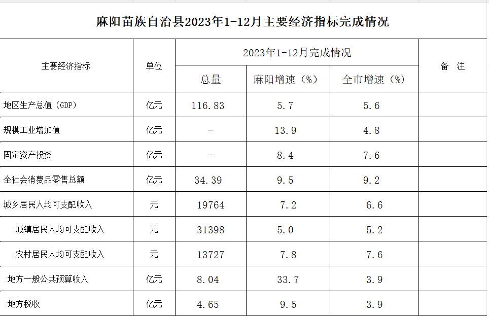麻陽苗族自治縣2023年1-12月主要經濟指標完成情況 麻陽苗族自治縣人民政府 https://www.zwgsc.com 發布時間: 2024-02-19 12:22 【字體:大 小】 麻陽苗族自治縣2023年1-12月主要經濟指標完成情況 分享到 來源:麻陽縣統計局 作者: