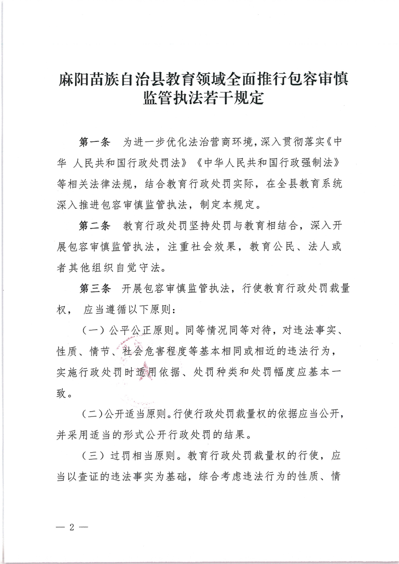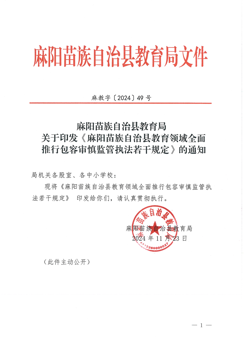 麻陽苗族自治縣教育局關於印發《麻陽苗族自治縣教育領域全麵推行包容審慎監管執法若幹規定》的通知 麻陽苗族自治縣人民政府 https://www.zwgsc.com 發布時間: 2024-11-23 10:26 【字體:大 小】 分享到 來源:麻陽縣教育局 作者: