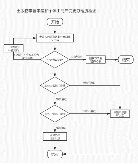 《出版物市場管理規定》從事出版物發行業務的單位、個人變更出版物經營許可證登記事項,或者兼並、合並、分立的,應當依照本規定到原批準的出版行政主管部門辦理審批手續。出版行政主管部門自受理申請之日起20個工作日內作出批準或者不予批準的決定。批準的,由出版行政主管部門換發出版物經營許可證;不予批準的,應當向申請單位、個人書麵說明理由。 |