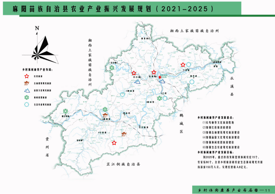 2025年,力爭將麻陽建成全國知名生態長壽文化旅遊勝地,成為全國重要的旅遊目的地,打造“中國中南第一康養苗寨”。努力建成休閑農業和鄉村旅遊重要目的地。推出3個鄉村旅遊集群片區和8個鄉村旅遊園區,全縣鄉村旅遊消費突破10億元。
