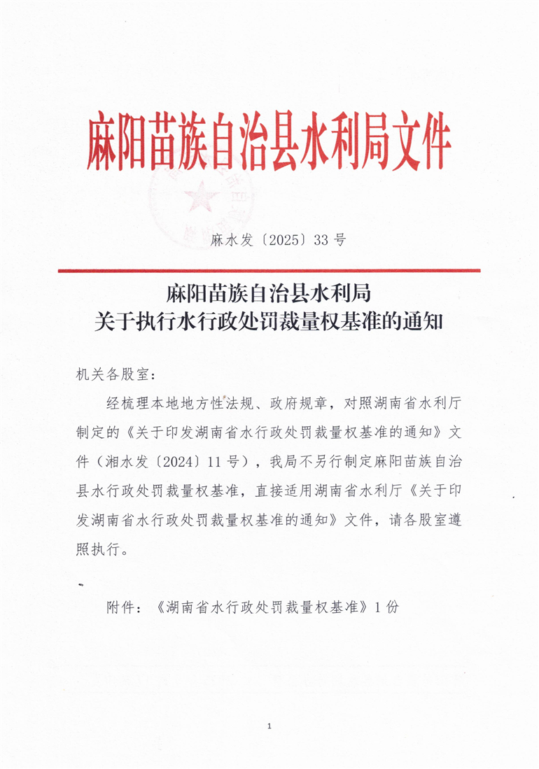 麻陽苗族自治縣水利局關於執行水行政處罰裁量權基準的通知