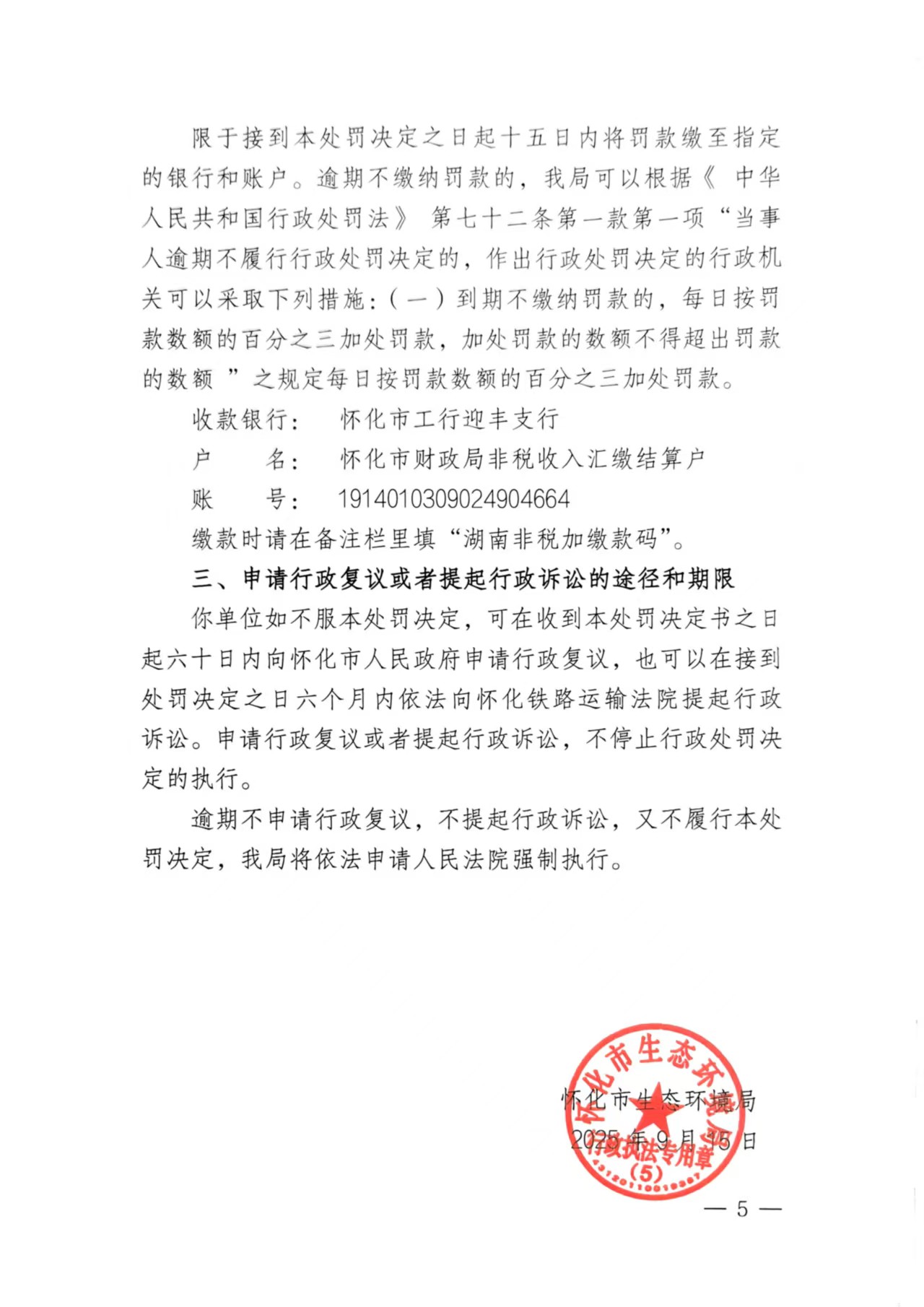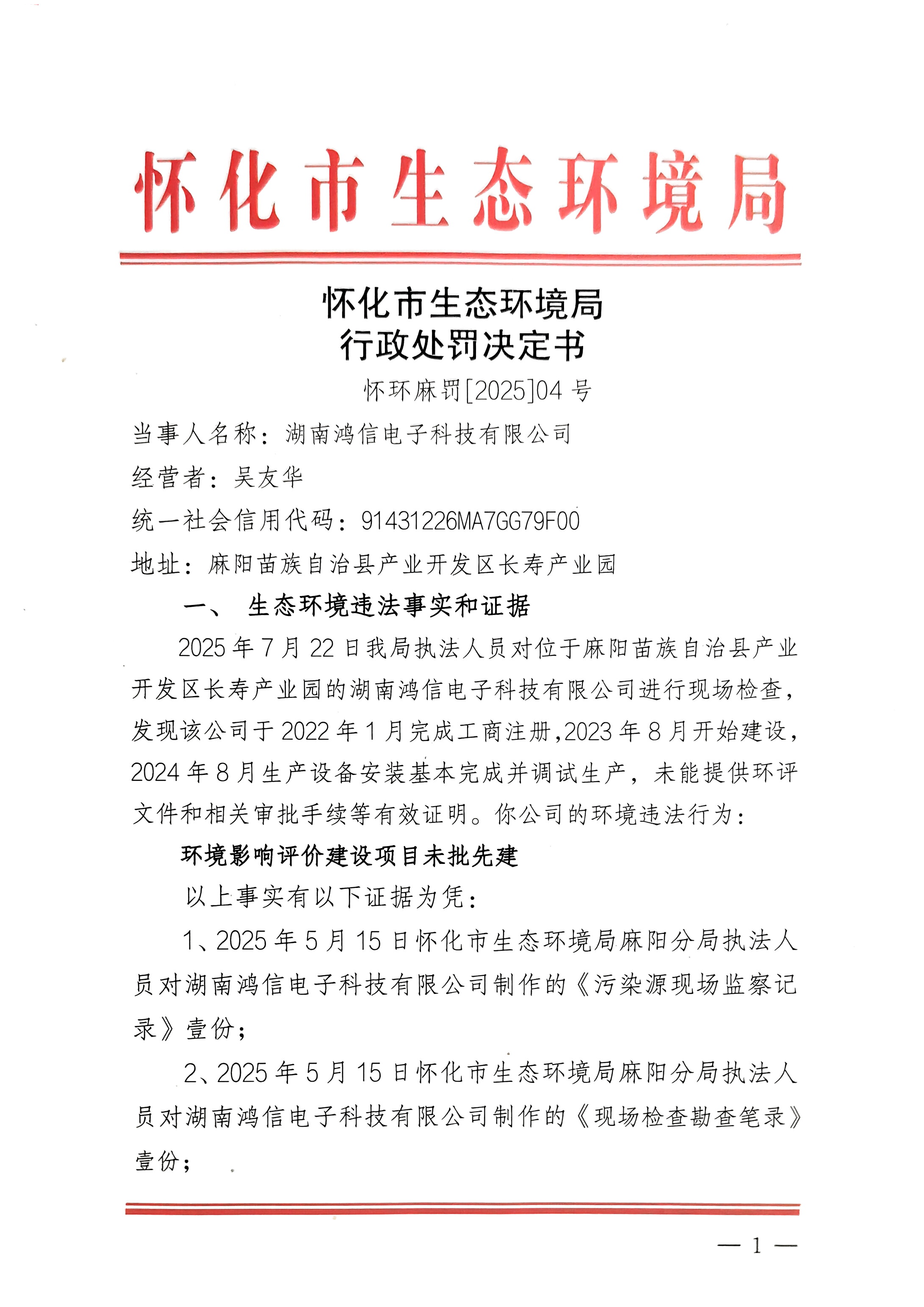懷化市生態環境局行政處罰決定書 懷環麻罰〔2025〕04號