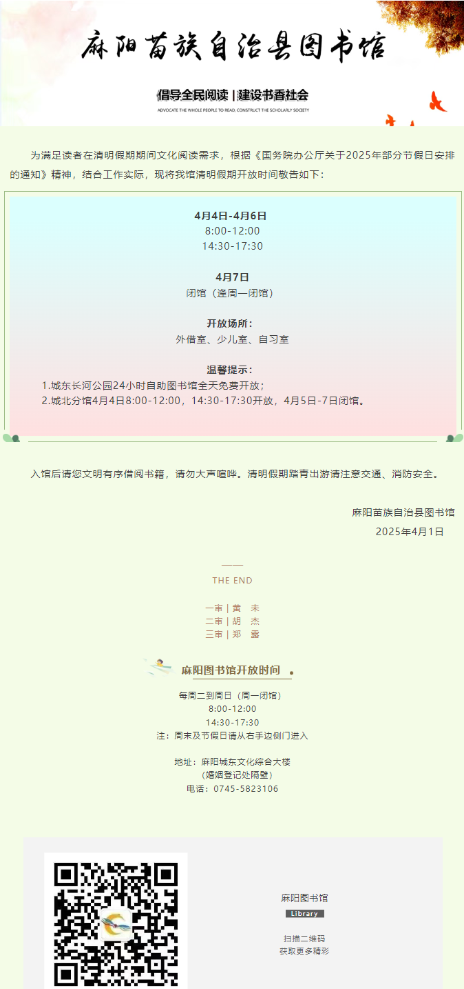 麻陽圖書館清明期間開放安排