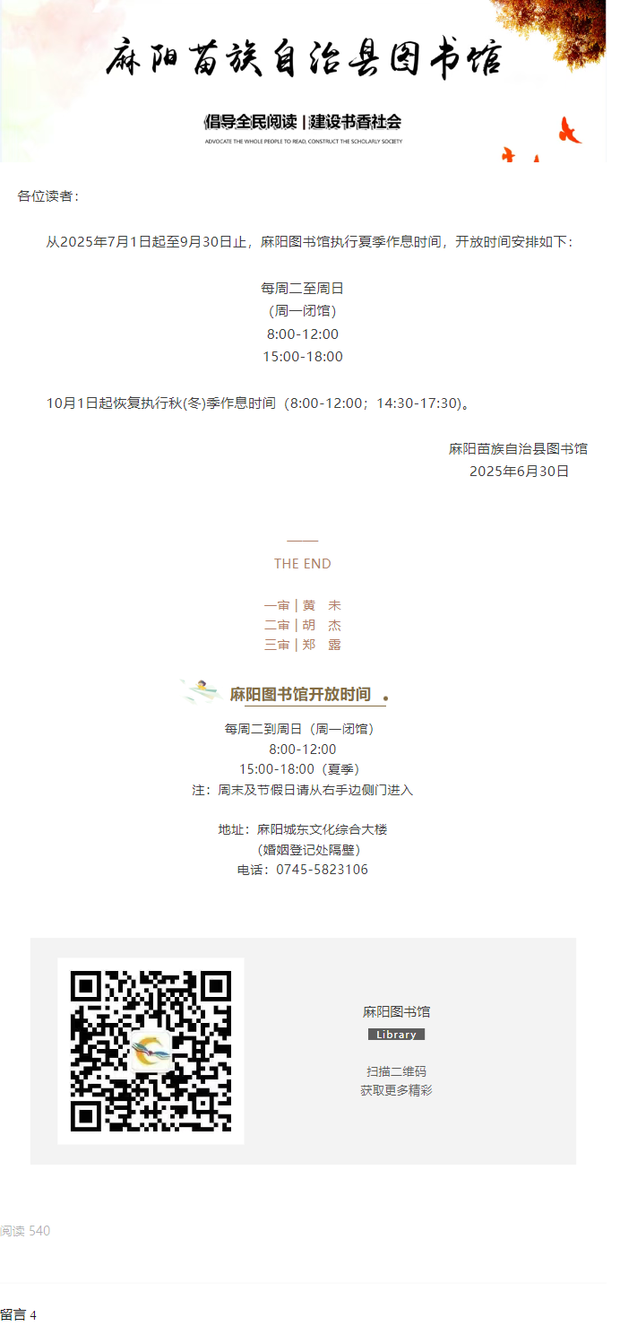 7月1日起,麻陽圖書館調整開放時間